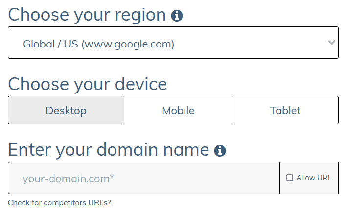 Start by choosing your region and your device. Then fill out your domain name to see how your holiday accommodation ranks. You can even keep an eye out on the competition by filling out your competitors URL’s.