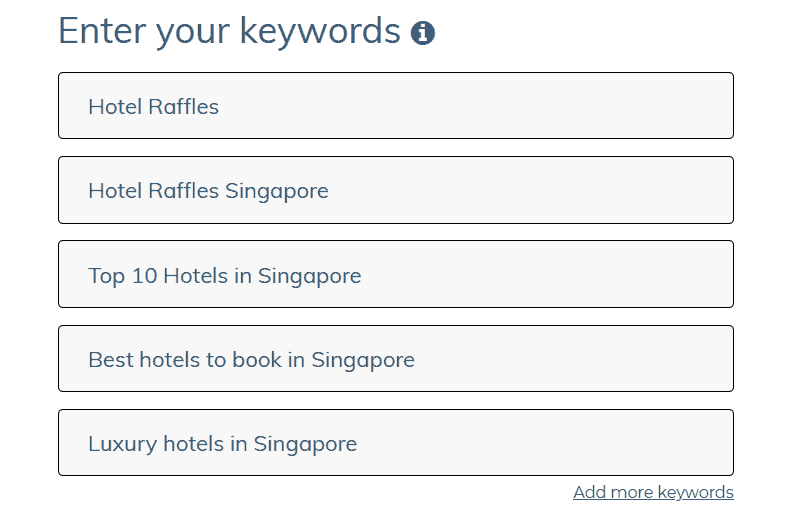 Once you done that, you enter your keywords for your accommodation for which you want to find your rankings. The keywords you use for your property can vary depending on the context, your specialty and user intent. However, some commonly searched keywords related to hotels include:
